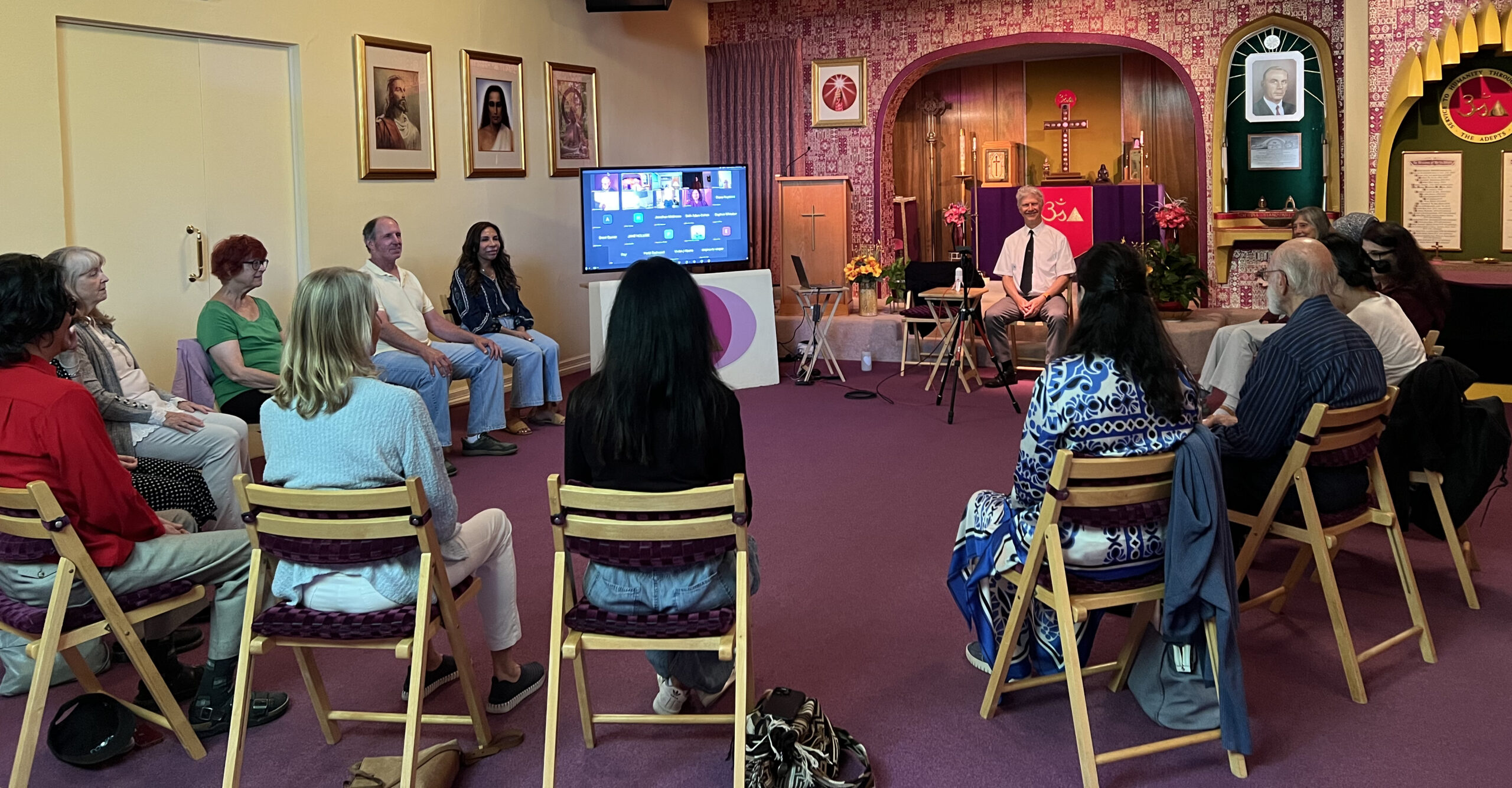 We normally chant the A-U-M 108 times, i.e. a full mala, which takes about 30 minutes. (A mala is a prayer necklace commonly used in the East containing 108 beads). After this there is a period of silence for contemplation followed by a group prayer for world peace.
